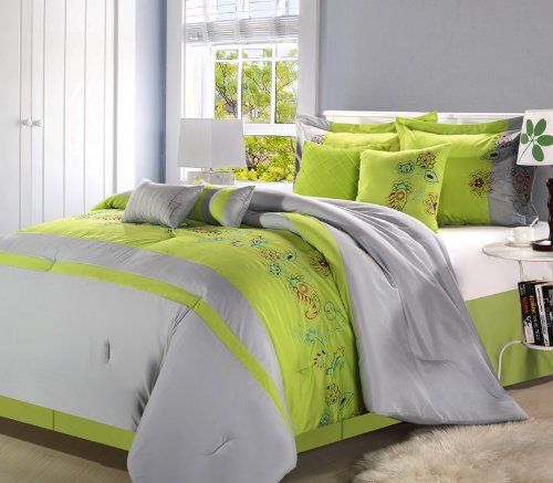 12pc Nori Grey/Neon Green Luxury Bedding Set- California King Feature