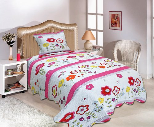 Read more 2 Pieces White with Lily Flowers Microfiber Quilt Bedspread Set Twin Size
