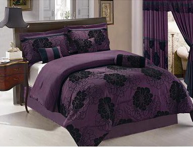 7 Pc Modern Black Purple Floral Comforter Set / Bed in a Bag - King Size Bedding Feature