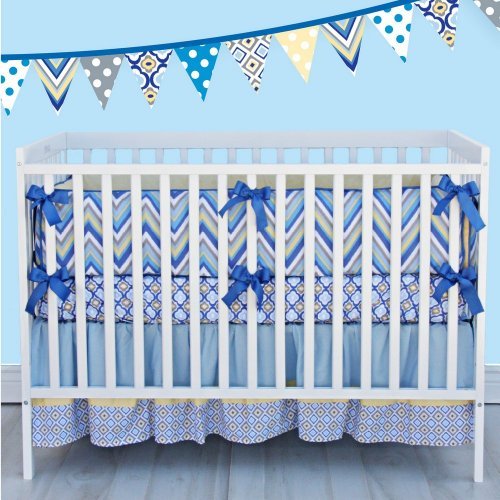 Sold in 3 piece sets: bumpers, sheet, and skirt. Bumpers are slip-covered for easy cleaning. All bumpers are 2" thick and stand at least 11" tall. Separate bumpers are ideal for conversion cribs. Extra long grosgrain ribbon ties keep bumpers secure while giving the bedding a clean finished look. All 3 patterns are used in each set to compliment color and style and give depth to any room. Additional sheets and matching changing pad covers are available.