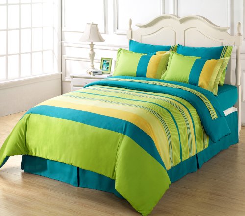 This complete 8-piece reversible bedding set instantly dresses a room with its bright blue, green, and yellow striped pattern design.