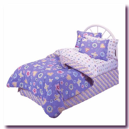 Hearts and Butterflies Full Size Bedding Set. Includes full comforter 76" x 86", 2 pillow shams 20" x 26", full bedskirt 54" x 76", and full sheet set. Full sheet set is 180 thread count, flat sheet 81" x 96", fitted sheet, and two standard size pillowcases 20" x 30". 60% cotton, 40% polyester.