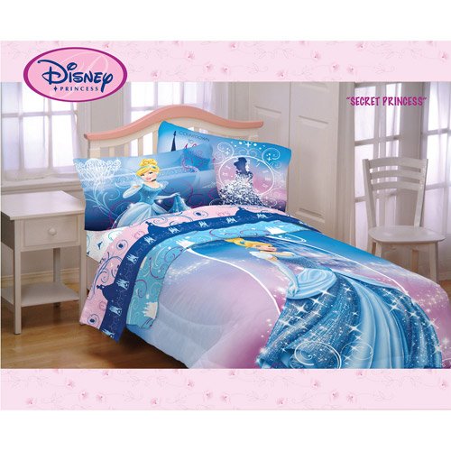 Your little girl will sleep like a princess with this Disney Cinderella Secret Princess Twin Comforter. The 100-percent polyester fill of this comforter will keep kids warm and cozy on cold of nights. This Disney Full Comforter will fit on Full-size and Twin beds. Cinderella is depicted on the comforter in stunning shades of blue and purple. The image of Cinderella in her ball gown will have little girls dreaming sweet dreams. The Disney Princess Comforter is a wonderful addition to your princess's room. The comforter can be easily cleaned by machine washing in cold water and then tumbled dried.