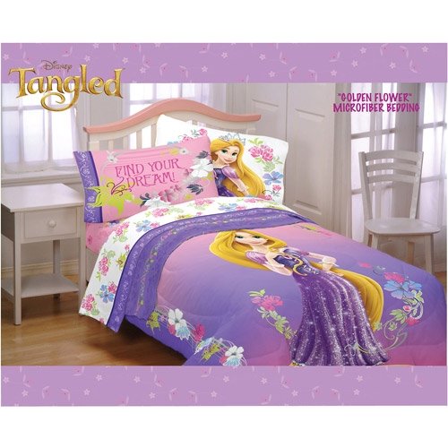 5 Piece Comforter and Full Sheet Set. 1 Flat Sheet, 1 Fitted Sheet and 2 Pillow Cases and Comforter. Disney Tangled Assemble! Children can incorporate Tangled movie star Rapunzel into their bedroom decor! The vivid designs and patterns almost bring the adventure to life with bold, bright colors that will please any young lady.