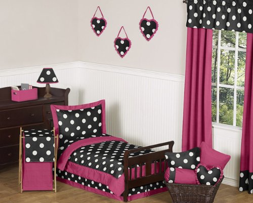 The 5pc Pink and Black Hot Dot toddler bedding collection by Sweet Jojo Designs will add an instant POP to your child's room. This designer girl toddler bedding set uses a sensational collection of Sweet Jojo Designs exclusive 100% Cotton fabrics. It has a funky black and white large dot print paired with bold hot pink cotton. The bright and fun color palette of black, white, and hot pink will set your room up in high modern style. This Sweet Jojo Designs set will fit all standard toddler beds and is machine washable for easy care and repeated use. Sweet Jojo Designs creates various coordinating room accessories for all of their children's bedding sets including hampers, wall decor, lampshades and window treatments.