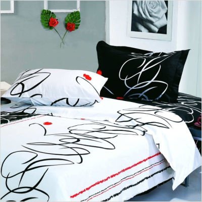 The black and white pattern of this duvet cover set will give a modern look to a bedroom. Black and white floating ribbons are alternating with accents of red flowers.