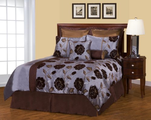 Brown flocked and printed vine and flowers design on a faux silk solid blue ground define this beautiful 8 piece comforter set. Tranquil colors and soft flock texture will bring serenity to your bedroom. Set includes generously sized comforter, 2 standard or king shams, bed skirt, 2 European style shams, and 2 decorative pillows.