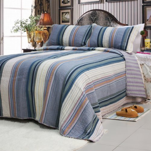 Read more [Adonis] 100% Cotton 3PC Vermicelli-Quilted Striped Patchwork Quilt Set (King Size)