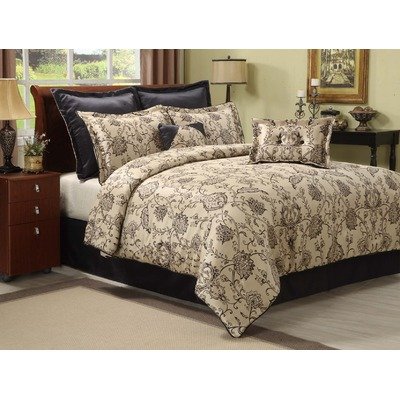 The Corine 8-Piece King comforter measures 104-inch by 90-inch has black corded trim and includes 2 standard shams, 2 euro shams, one solid bed skirt, one matching square pillow and one oblong pillow. The comforter is 100-percent polyester and is dry clean only. The beautiful updated all-over scrolls of rich chocolate brings out the luxurious elegance offset by the solid color bed skirt and euro shams that make this a great addition to your room decor. The decorative pillows add the right touch in contemporary style.