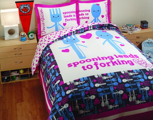 Spooning…forking…you know what’s next right? Sporks. David and Goliath’s Spooning Duvet Cover Set, is made from 300-thread count 100-percent cotton sateen that provides comfort, brilliant color registration and easy care. The 90-inch by 92-inch duvet cover is reversible, with a large print of David and Goliath's spoon and fork design on a white ground on one side, and a sweet heart print in pink on white on the other - you can flip your duvet cover to match your mood. The 3-piece Duvet Cover Set also comes with two matching 20-inch by 26-inch Standard Shams, all packaged in a recyclable David and Goliath cardboard box. Made in China.