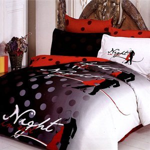 - This beautiful bedding set in red, black and white features a dancing couple at Night in Red and reverses to red with dark gray pock-dots.