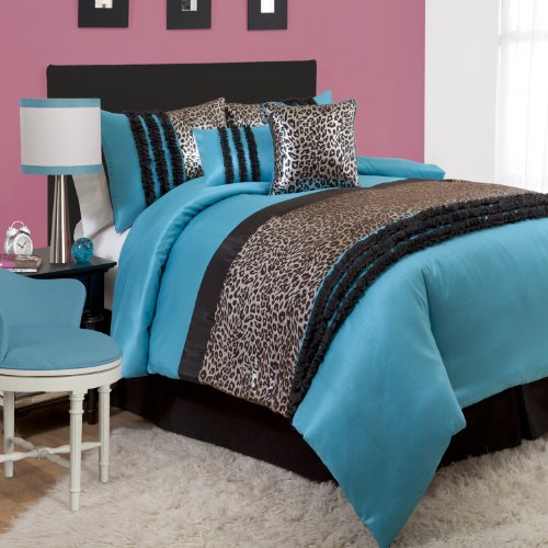 This metallic animal print and faux silk comforter is a great way to make your child's room stylish and hip. Animal prints are so fashion forward and the added details such as the ruffled stripe will make this the room everyone wants to hang out in. The set includes the comforter, bed skirt and 1 sham and 2 decorative pillows. Comforter: 66-inch W by 86-inch D, bedskirt: 39-inch W by 75-inch D plus 14.5-inch H, sham: 26-inch W by 20-inch D, square decorative pillow: 16-inch D by 16-inch W, oblong decorative pillow: 18-inch W by 12-inch D.