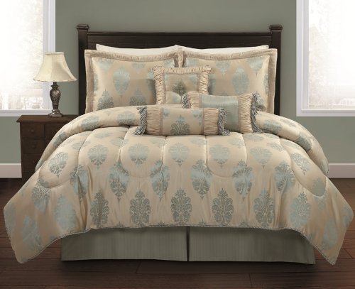 This woven jacquard comforter set with sophisticated designs is a luxurious addition to your bedroom. 3 decorative pillows included.Features Size: QueenColor: Aqua Blue/GoldThis set includes:1 Comforter (90"x90")2 Shams (20"x26")1 Bedskirt(60"x80"+14")3 Decorative Cushions Plus 300 Thread Count Cotton Sheets:2 Standard pillowcases (20" x 30")1 Queen flat sheet (90" x 102")1 Queen fitted sheet (60" x 80" x 14" pocket depth)
