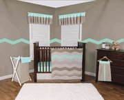 Patterned chevron stripes in calming colors are delicately quilted together giving your nursery a serene homespun feel. The Cocoa Mint 3-Piece Crib Bedding Collection features a lovely mixture of pinstripes, mini dots, gingham and damask diamonds in a tranquil color palette of mint green, taupe, gray and white with accents of brown. The stylish chevron motif and gender neutral color combination make this collection perfect for your baby boy or girl! Quilt is backed with the mint mini dot for decorating versatility.