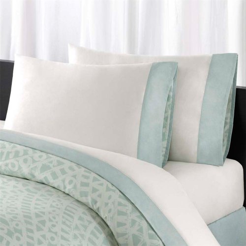 Mykonos sheet set is a simple white sheet with a 1" pastel green edge on the top of sheet and edge of the pillowcases.