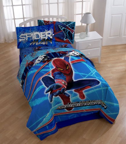 One Marvel Comics Amazing Spider-Man Stick With Me twin bedding set. Included are one Twin-single size comforter, flat sheet, fitted sheet, and one standard pillowcase. ... CONTENTS: One twin size comforter 64 x 86 in. (163 cm x 218 cm); One twin flat bed sheet, finished size 66 x 96 inches (168 x 244 cm); One twin fitted sheet. Both of the above sheets fit a standard twin mattress of 39 x 75 inches.; One standard Pillowcase, finished size 20 x 30 inches (51 x 76 cm) to fit 20 x 26 inches pillow