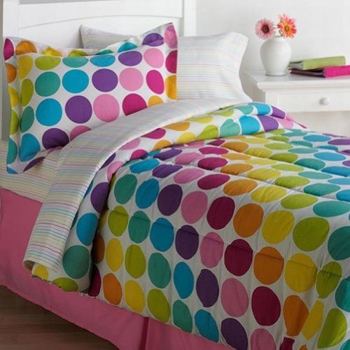 This The Big One Dots 6 piece bed in a bag set has a great look. It features a pattern of colorful polka dots on a white background. The set includes comforter, sheets, pillowcase, sham and bedskirt.